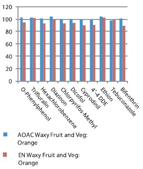 Pesticide suite was extracted using Biotage QuEChERS products and the relevant methodology (AOAC or EN) for orange. In all instances, recoveries were above 80%.