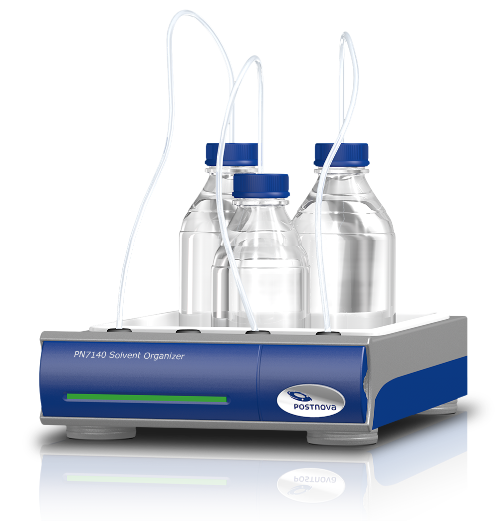 Holder for bottles and possibility of direct connection of up to 8 eluent lines via the integrated PEEK connector block.