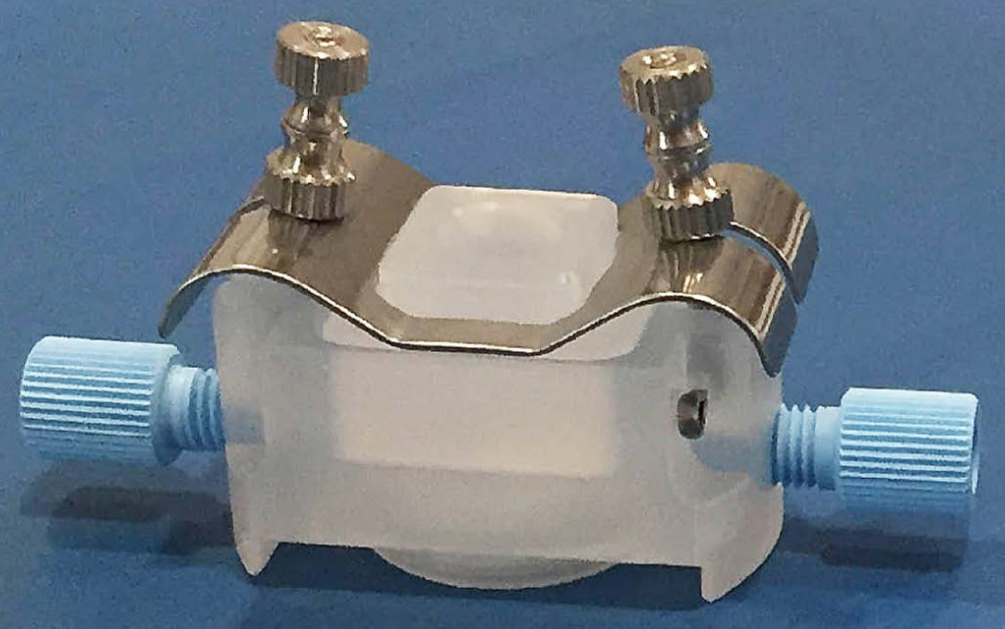 PermeGear in-line cells may be thought of as flow type Franz cells with very small receptor volumes. In-line cells locate the membrane of interest in the horizontal plane and have donor chambers open to the air although occluded donor chambers are available.