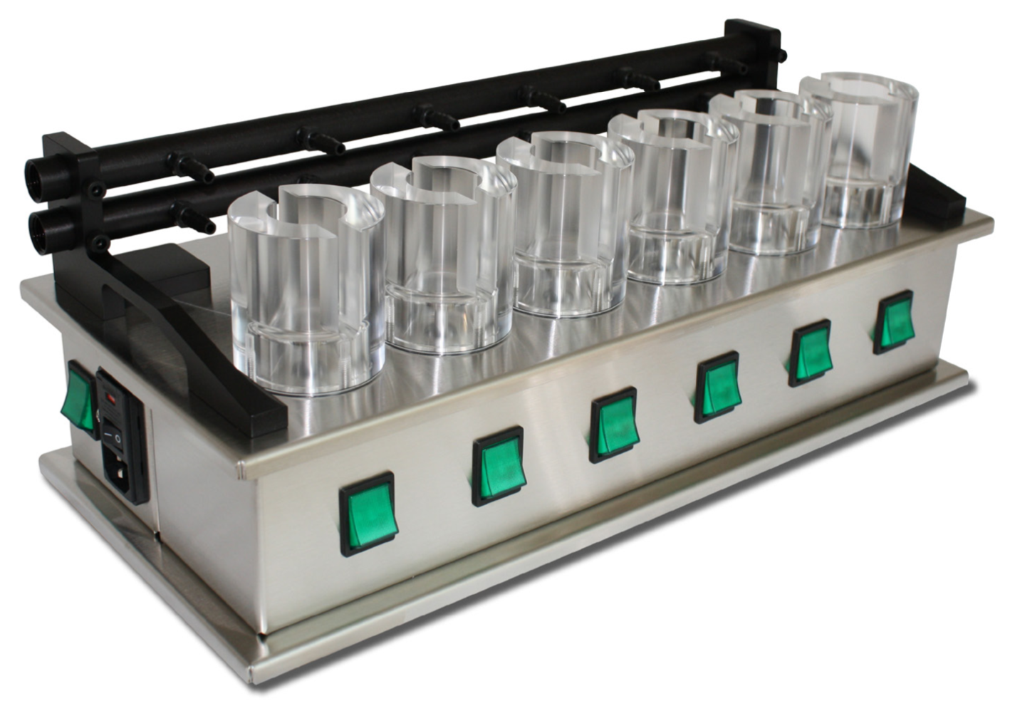 The PermeGear V6-CA manual diffusion system is an apparatus employing Franz cells for carrying out in vitro release testing (IVRT) and in vitro permeation testing (IVPT). The system enables a researcher to measure the release or permeation of a compound into or through membranes.