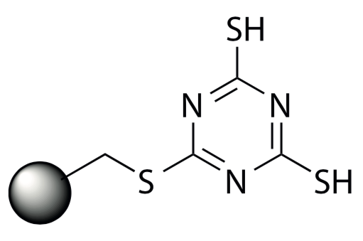 The Biotage MP-TMT is a macroporous polystyrene-bound trimercaptotriazine, a resin bound equivalent of 2,4,6-trimercaptotriazine (TMT). MP-TMT scavengers residual palladium from palladium catalyzed reactions and has also shown to remove other metals. The MP-base copolymer has been designed to yield a robust, low swelling material, which makes it ideal for restricted volume environments. Its unique pore structure provides greater access to the reactive sites resulting in faster reactions and higher recoveries.