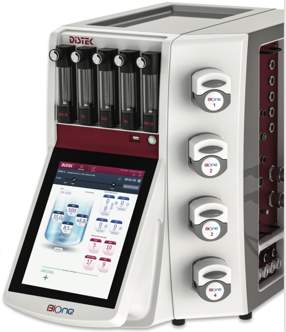 Distek has revolutionized benchtop scale bioreactors with their BIOne bioprocess control station for both mammalian and microbial models. The sleek appearance and intuitive touchscreen interface are only the beginning. The BIOne controller can seamlessly transition between traditional glass reactors and their BIOne single-use system. Easy to use, the BIOne bioprocess control station is powerful enough to develop processes at the benchtop scale. Designed to fit your needs, the BIOne controller can be customized to conform to your lab design: rotameters or auto flow control, left or right side setup, optical pH or standard, smart sensors or standard sensors and much more.