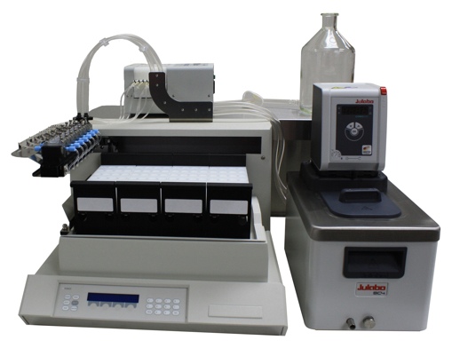 PermeGear automated diffusion cell systems are based on the continuous flow principle. A multi-channel peristaltic pump draws receptor solution from a reservoir through a distribution manifold and sends it to the In-Line cells. The cells are warmed to 32ºC by a heater/ circulator that pumps water through the cell warmer in which the In-Line cells are located. After filling the receptor chambers of the cells and purging the system of bubbles, the subject compound is then placed in the donor chambers of the cells. From that time, the fluid is collected in the vials of the fraction collector at user set time intervals. The vials are taken for analysis manually after the sampling time has elapsed.