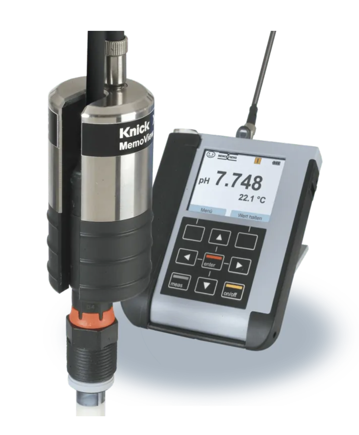 With the Knick MemoView, Memosens online measuring points without on-site display (e.g., in conjunction with MemoGate or MemoRail) can be queried contactless during operation. Users simply push MemoView onto the Memosens sensor connection and all the values and sensor data are displayed on the Portavo mobile analyzer — without interrupting the process.