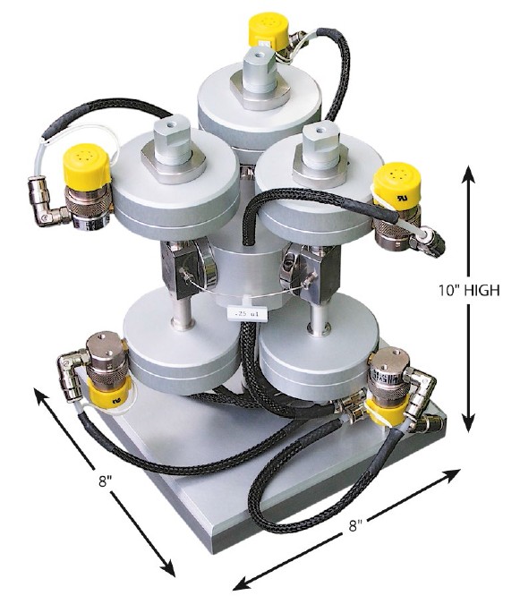 The VICI SPSS40 40K injector is comprised of six miniature air actuated needle valves, plumbed to simulate the flow path of a conventional rotor/stator injector. An integral controller sends the on/off positioning signals to each valve, coordinating them to perform load, inject, and flush functions. There are three methods for sending positioning commands to the injector: