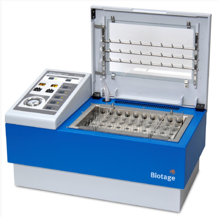 The TurboVap LV is commonly used for evaporation of solvents following solid phase extraction clean-up of drug samples, pesticide extracts, etc. It is ideal for sample volumes of 1 to 30 mL that need to be evaporated in GC vials, microcentrifuge tubes, conical bottom tubes or test tubes. It offers a high throughput solution with 50 sample positions.