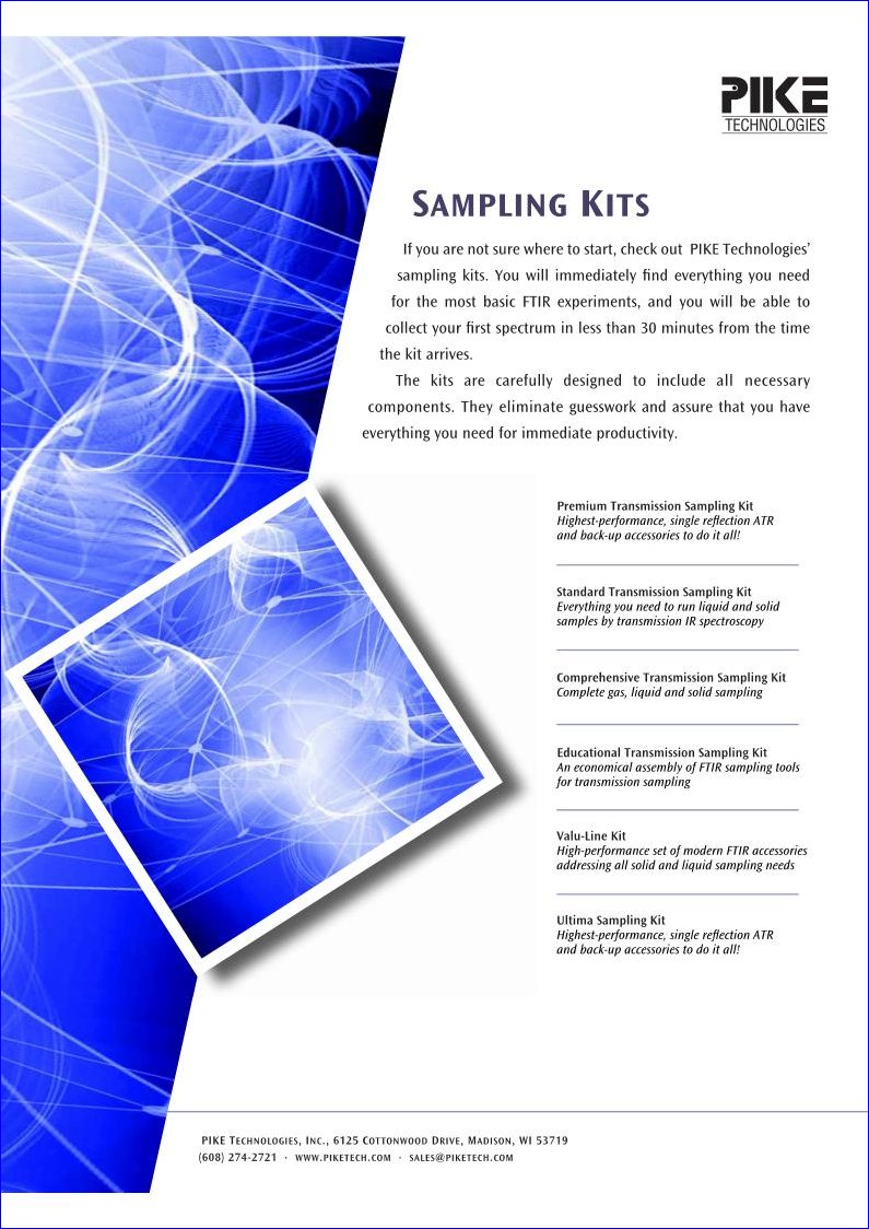 If you are not sure where to start, check out PIKE Technologies’sampling kits. You will immediately find everything you need for the most basic FTIR experiments, and you will be able to collect your first spectrum in less than 30 minutes from the time the kit arrives.
