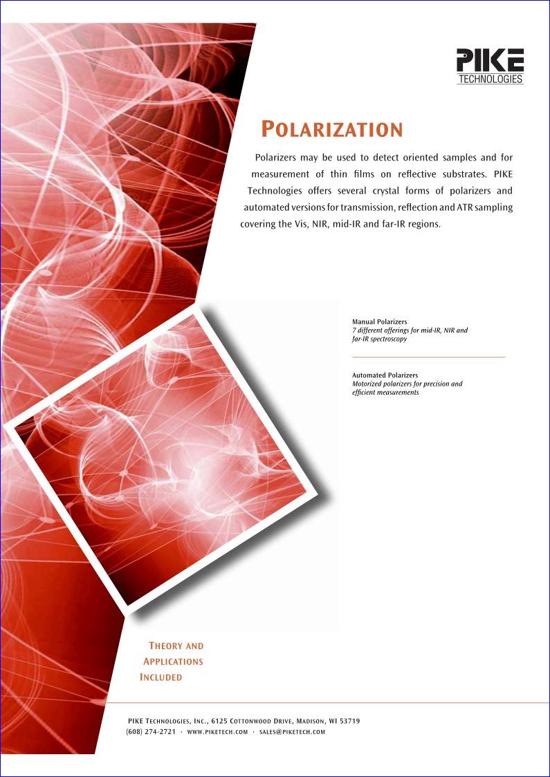 Polarizers may be used to detect oriented samples and for measurement of thin films on reflective substrates. PIKE Technologies offers several crystal forms of polarizers and automated versions for transmission, reflection and ATR sampling covering the Vis, NIR, mid-IR and far-IR regions.