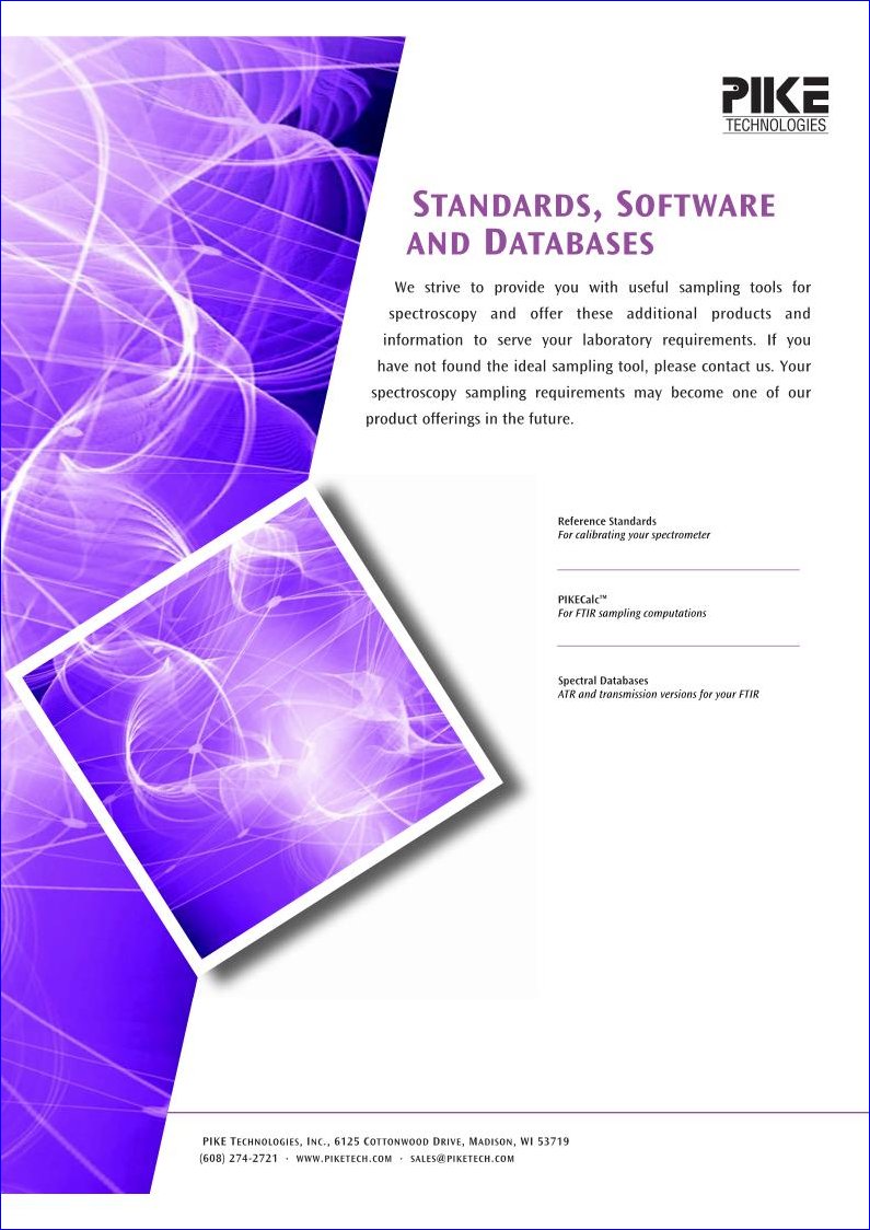 PIKE Technologies provides useful sampling tools for spectroscopy and offer additional products such as standards, software and databases. If you have not found the ideal sampling tool, please contact Norlab. Your spectroscopy sampling requirements may become one of PIKE Technologies product offerings in the future.