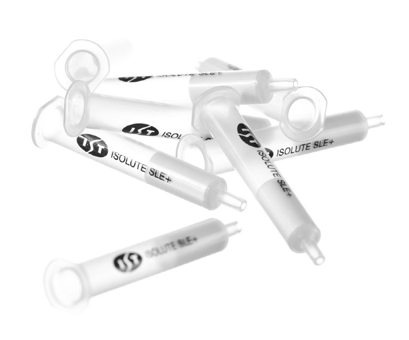 ISOLUTE® SLE+ Supported Liquid Extraction columns and plates are designed to provide stress free extraction of analytes from biological fluids, using a simple Load-Wait-Elute methodology. The supported liquid extraction (SLE) process is analogous to traditional liquid-liquid extraction (LLE) and utilizes the same water immiscible solvent systems for analyte extraction. Instead of shaking the two immiscible phases together, in SLE, the aqueous sample is immobilized on an inert support, and the organic phase flows through the support, eliminating problems such as emulsion formation and low analyte recoveries.