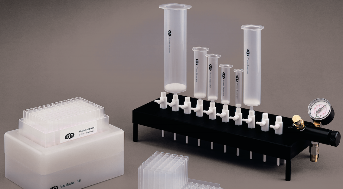Biotage ISOLUTE phase separators have been designed to rapidly separate chlorinated solvents from aqueous phases, under gravity. The phase separators are available in a comprehensive range of column sizes (3, 6, 15, 25, 70 and 150 mL) and also in 96-well plates (fixed well and the versatile ISOLUTE array formats). Unlike other phase separation devices, no vacuum or positive pressure is required – the separation is achieved under gravity. The phase separator is impervious to aqueous solvents, but allows the passage of water immiscible solvents of a higher density than water.