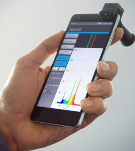 The GoSpectro is a device that turns any smartphone or tablet into an ultracompact and powerful light handheld spectrometer. GoSpectro is sensitive over the entire visible range (400 nm – 750 nm) with a spectral resolution of less than 10 nm and a reproducibility of 1 nm.