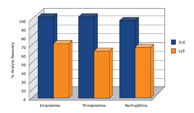 Recovery of tricyclic antidepressants from plasma, typical ISOLUTE SLE+ procedure compared with the equivalent LLE procedure