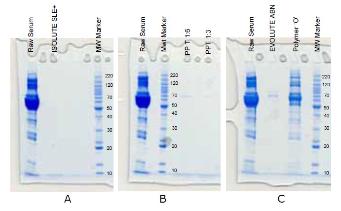 To demonstrate the effectiveness of ISOLUTE SLE+ in removing proteins from biological fluid samples, serum was prepared using ISOLUTE SLE+, protein precipitation and solid phase extraction. Residual protein in the extracts was analyzed using gel electrophoresis. Complete protein removal was seen with ISOLUTE SLE+.