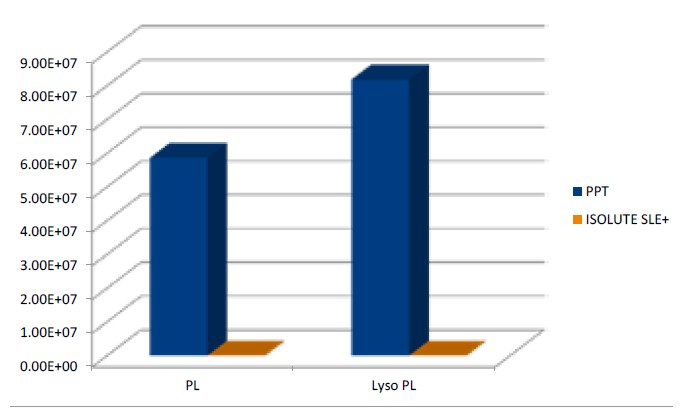 Comparison of phospholipids and lysophospholipids present in sample extracts prepared using protein precipitation (PPT, 100μL human plasma precipitated with 300μL acetonitrile) and ISOLUTE SLE+ (100 μL human plasma extracted using MTBE)