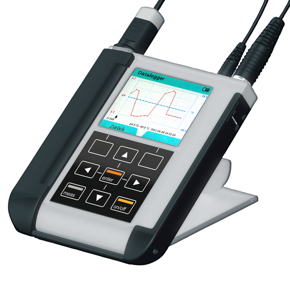 Every Portavo meter has a graphical color display, data logger, USB port and a Li-ion battery. The ultra-flat yet robust housing is protected against strong jets of water and fits comfortably in the hand. The integrated sensor quiver protects the sensor against drying out.
