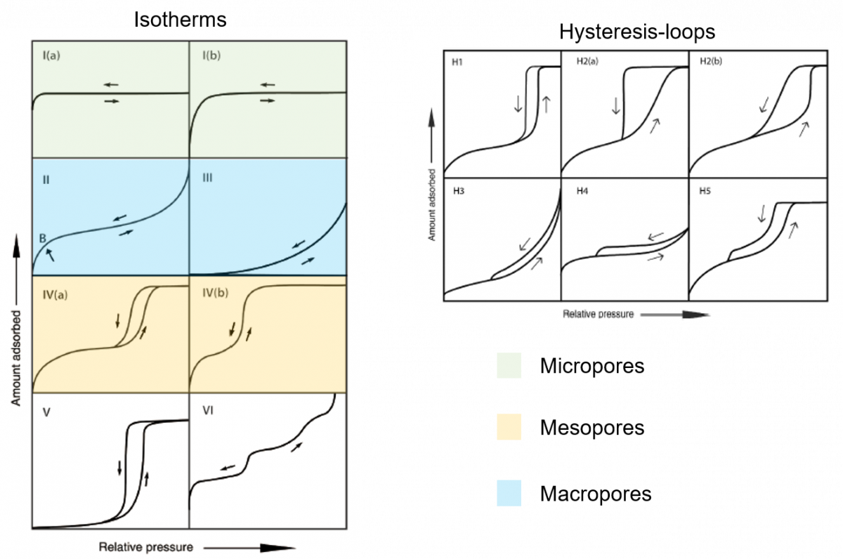 The figure illustrates the classification of isotherm and hysteresis types according to the surface and pore structure of non-porous, micro-, meso- and macroporous materials. Besides BET surface area calculations (see corresponding method on this website) isotherms are used to determine pore volumes (micropore- and total pore volume) as well as pore size distributions. Traditional models are e.g. the BJH method for mesopore analysis, the Gurvich rule for total pore volume calculations or Dubinin equations for micropore analysis. To improve these models different groups around the world develop new calculation models. State-of-the-art models are the so-called DFT (density functional theory) models and Monte-Carlo simulations.