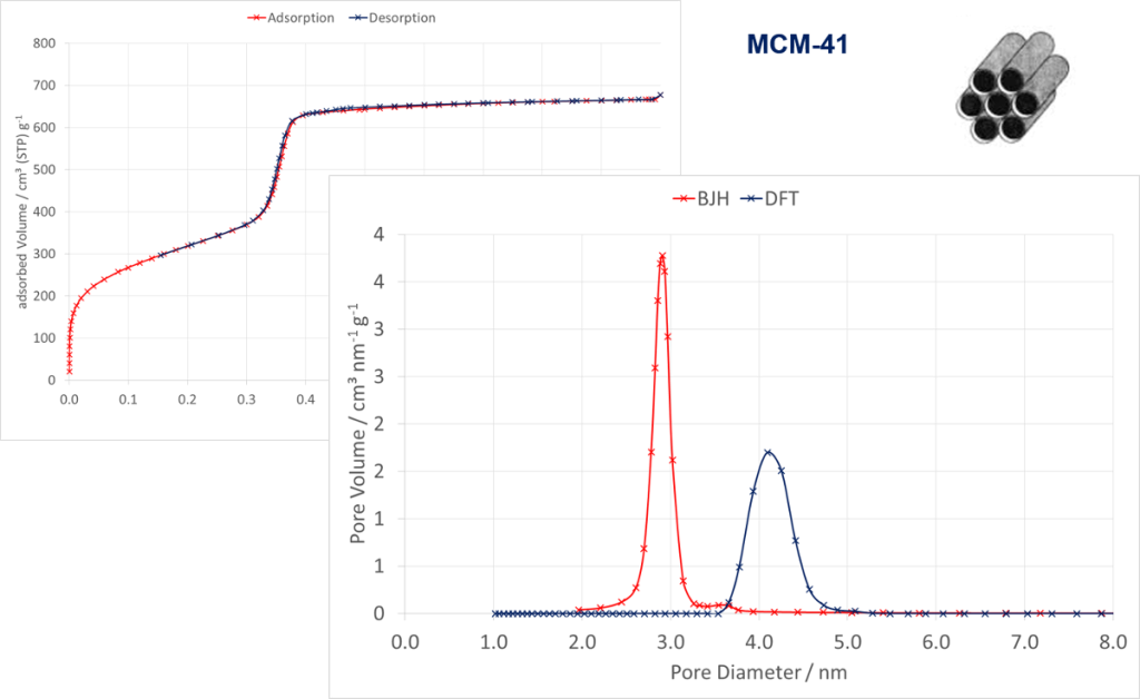 The following figure shows an isotherm of a MCM-41 material measured with Nitrogen at 77 K. The applied evaluation models depends on the type of isotherm and therefore on the kind and ratio of pores. For small mesopores the classical BJH- and modern NLDFT methods were applied. These results show that both methods differ and the real pore size of approx. 4.1 nm could not be calculated exactly by the BJH method.