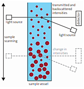 The analysis is an optical measuring procedure: with two light sources and a detector, the light transmitted through and scattered back by the sample is analysed. The transmission and backscattering intensities directly depend on the number, size and type of dispersed particles. Hence the light intensity changes while the dispersion destabilises. Stability analysis tracks these changes by scanning the sample repeatedly for a certain experiment duration. During the measurement the whole sample height is scanned, therefore both global and local changes in the sample are detected.