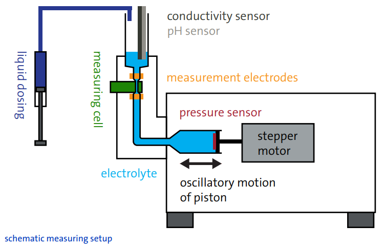 DataPhysics Instruments patented a measuring technique that uses an oscillatory flow of electrolyte solution through or along the sample. The streaming potential and the currently applied pressure are measured simultaneously together with the temperature, conductivity and pH value of the electrolyte solution. Through the wide range of applicable flow frequencies and amplitudes a fast and precise measurement is possible.